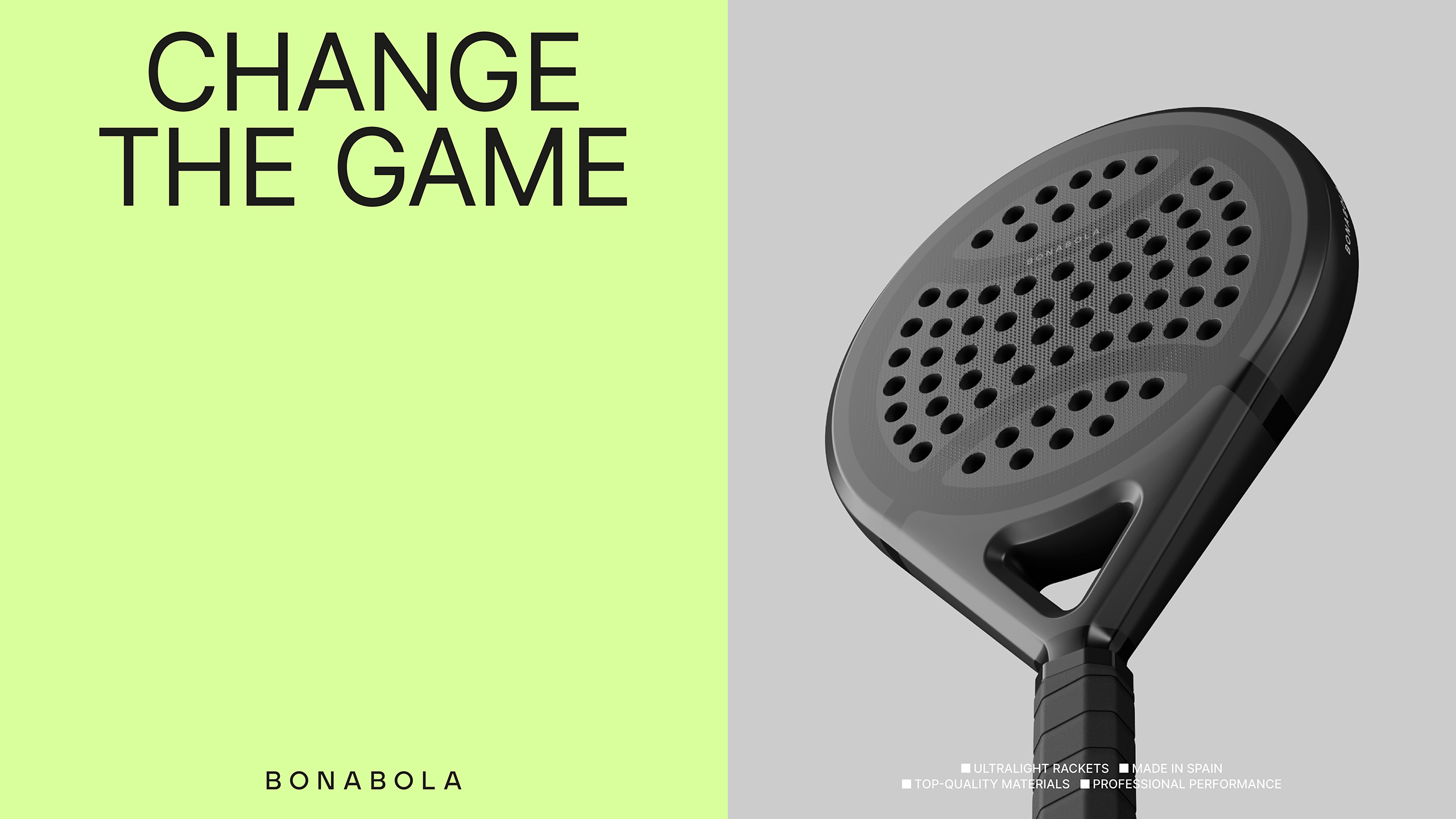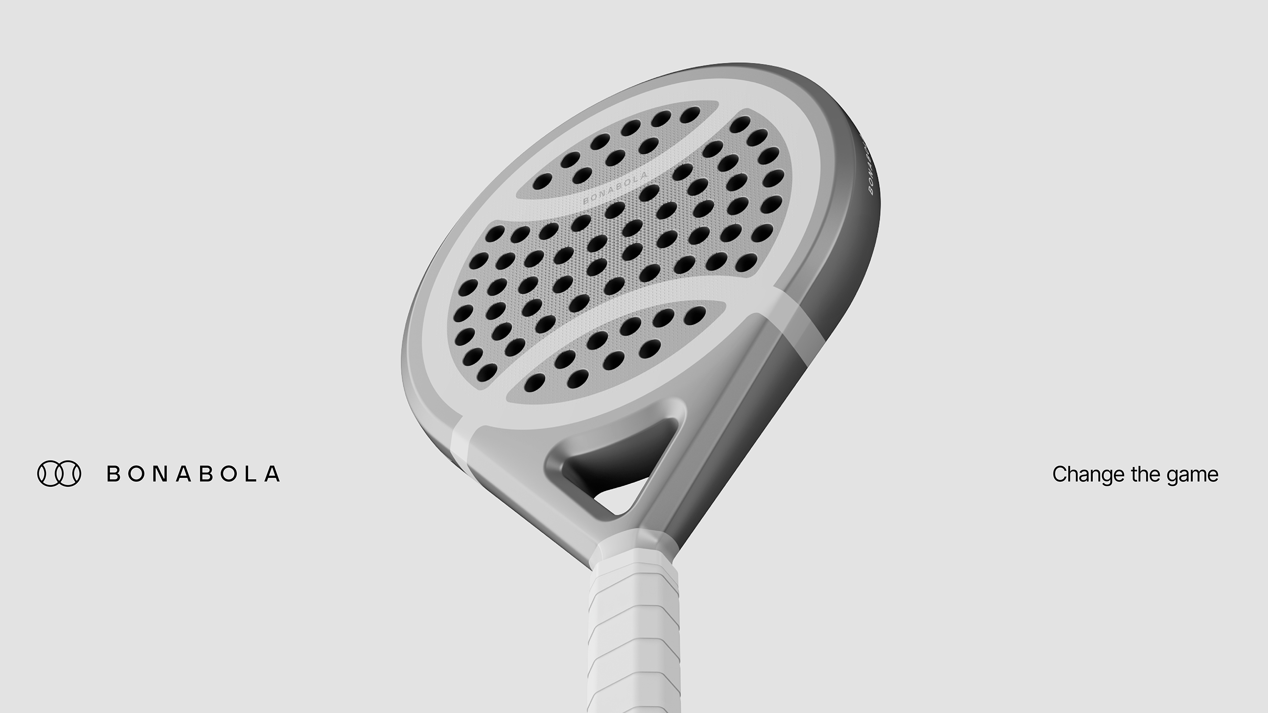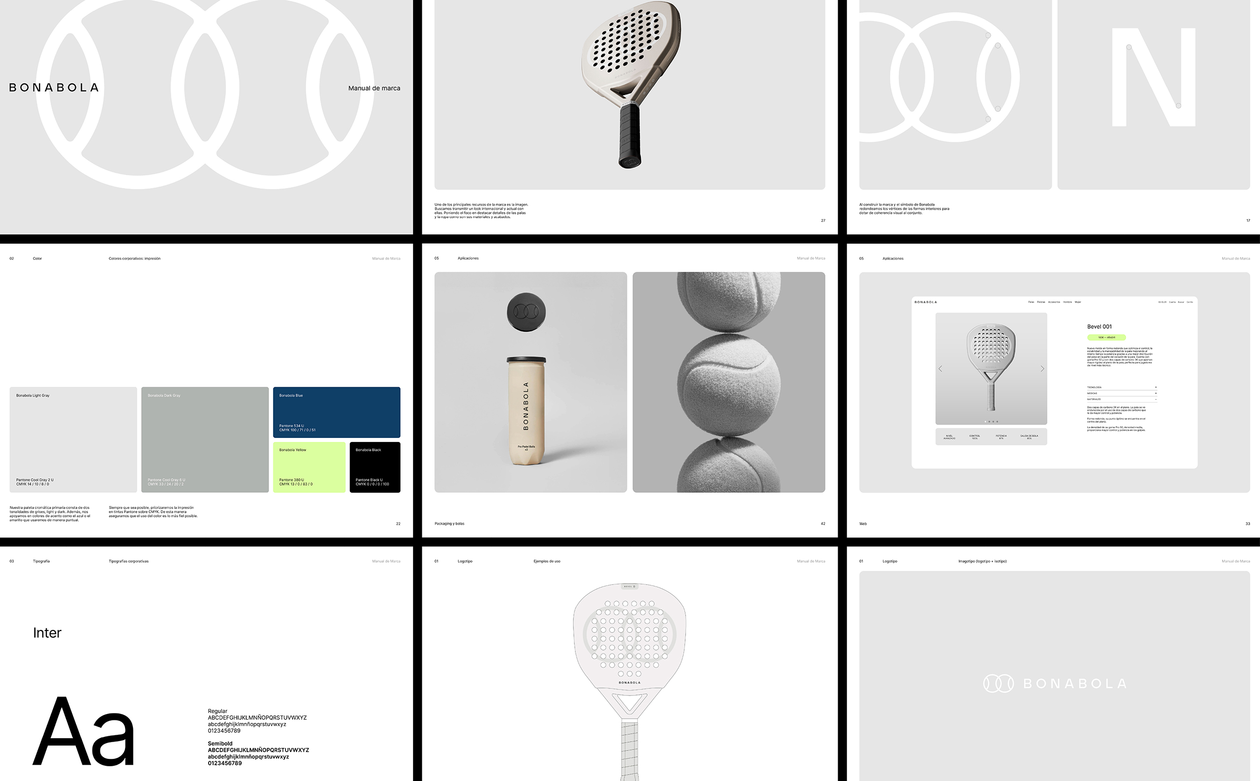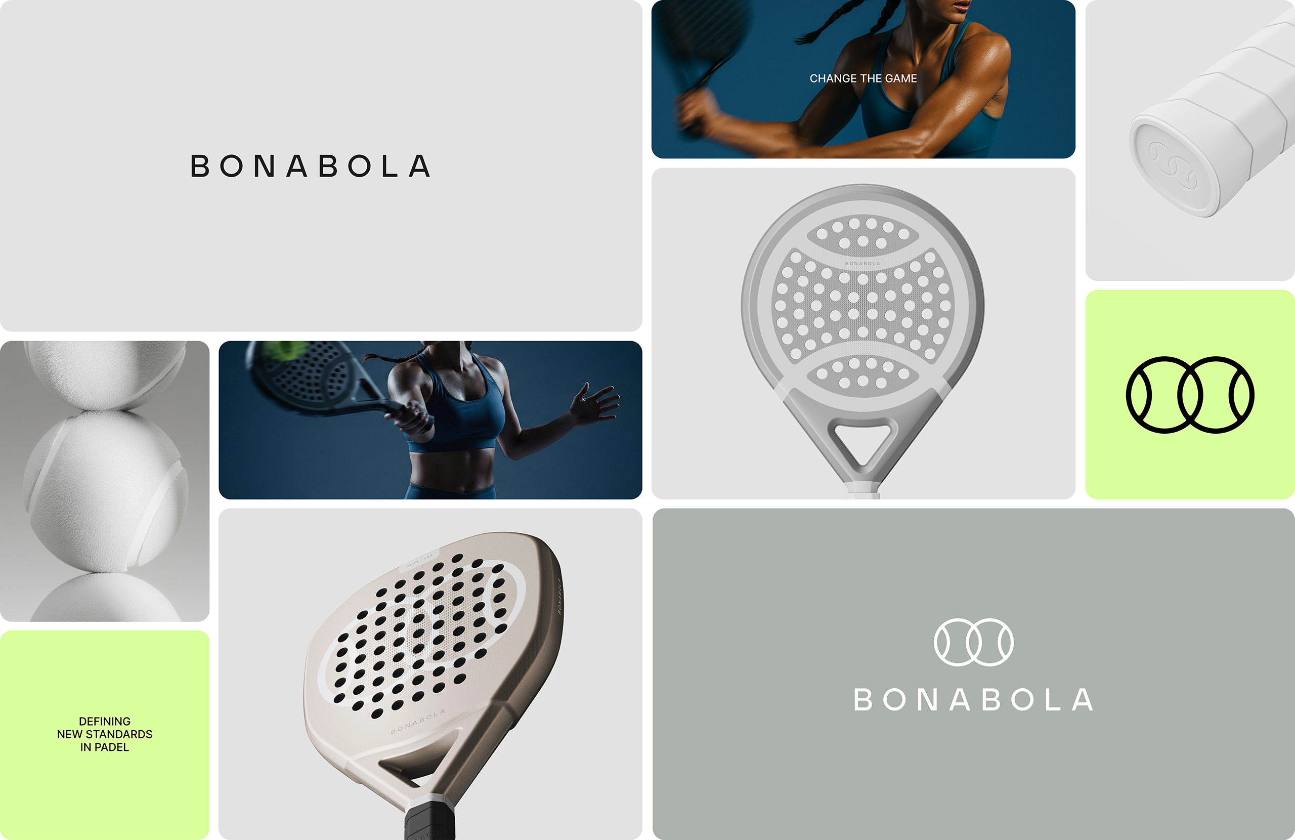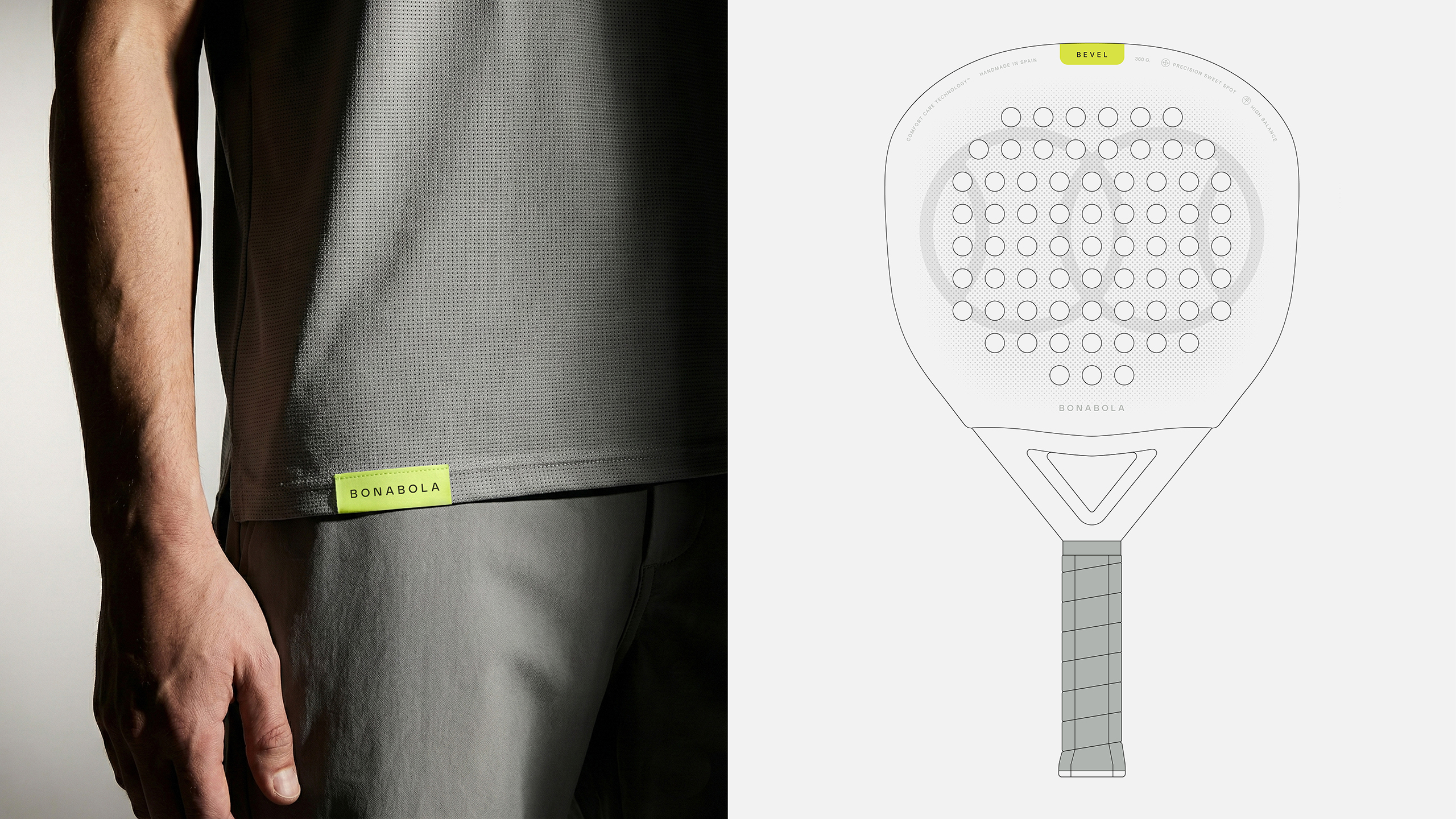 The project is built around a clean and essential system. The symbol, inspired by the intersection of two balls, refers to the fact that padel is always played in pairs, while the name BONABOLA connects the brand to its place of origin, as it means “Good Ball” in Valencian.