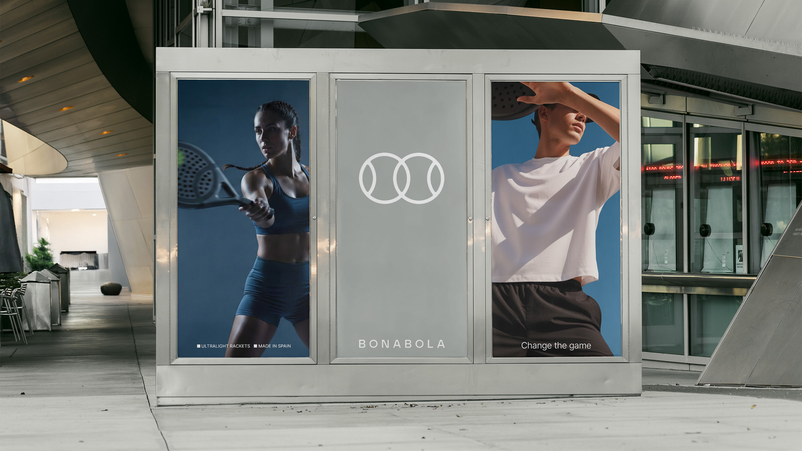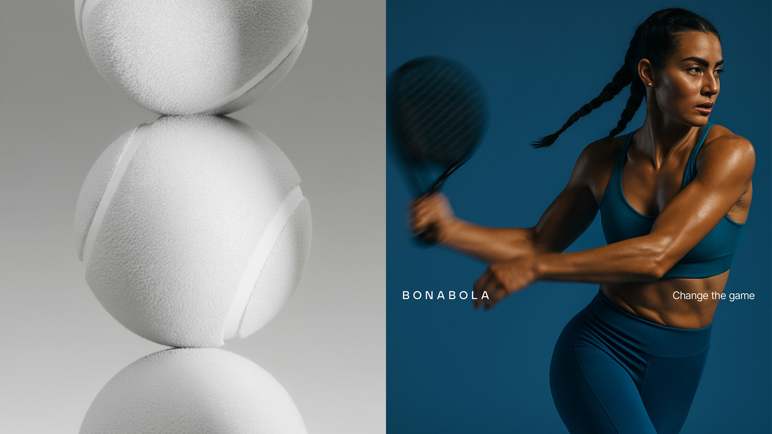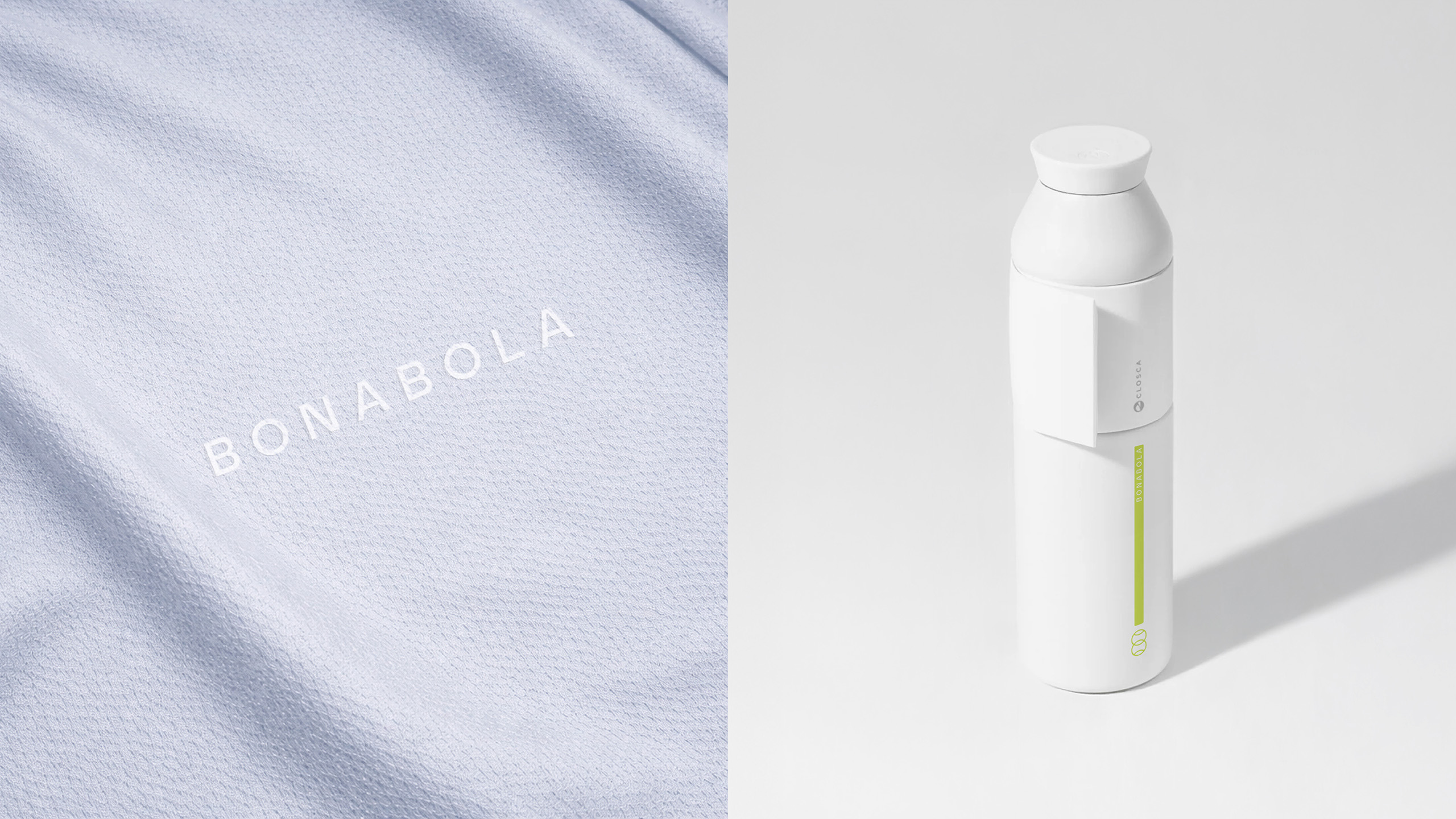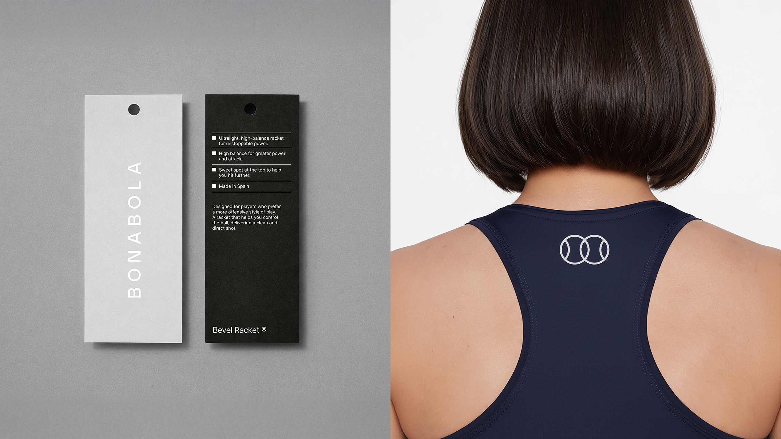 The project is built around a clean and essential system. The symbol, inspired by the intersection of two balls, refers to the fact that padel is always played in pairs, while the name BONABOLA connects the brand to its place of origin, as it means “Good Ball” in Valencian.