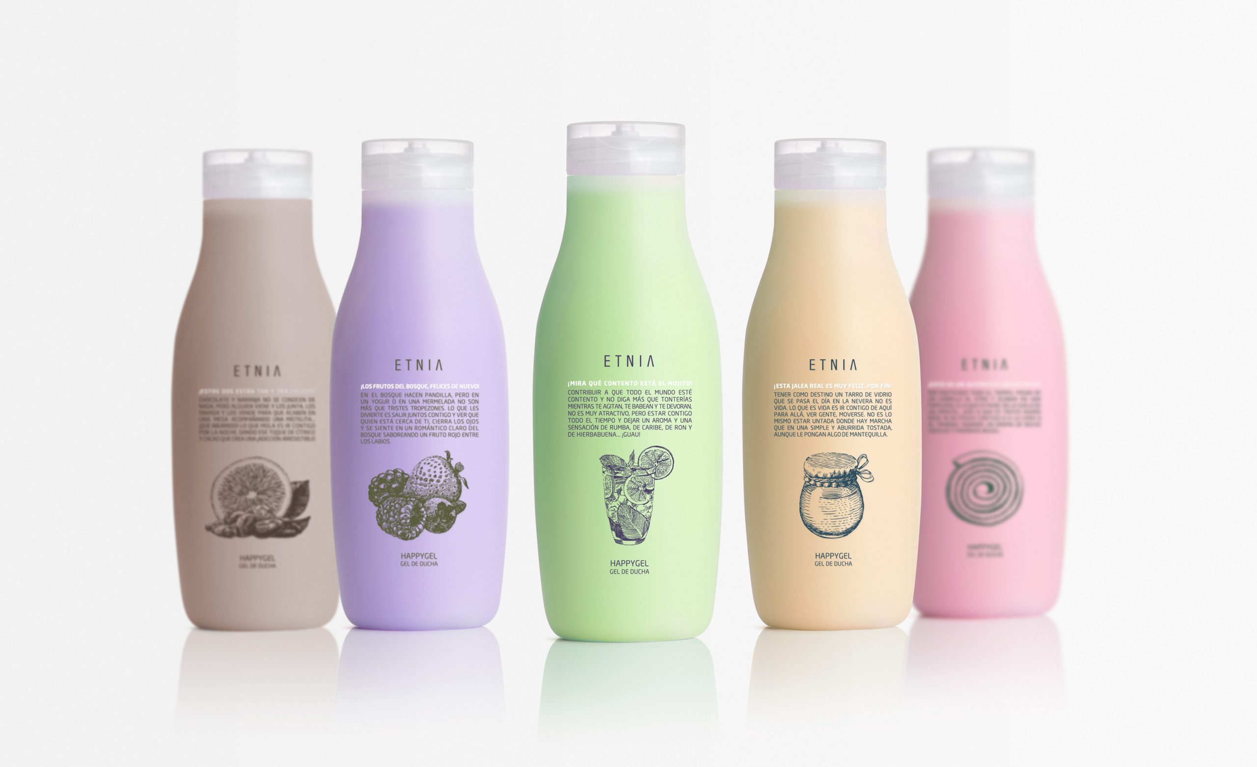 Fruit, chewing gum, biscuits, mojitos that have become part of the mundane waiting to be consumed or end up in the bin, have found a new lease of life in ETNIA’s fun and exciting new ‘Happy’ range. They have been reinvented as body lotion (Happybodys) and as shower gel (Happygels), resulting in appealing and unique fragrances. Happygels are a part of the young and exciting product lines on offer at ETNIA , a new make-up and cosmetics brand. It is design with communication focused on young people, and with sense of humor playing a central role in the bottle design, illustration (old etching print meets comic strip), and in the casual and suggestive copy.