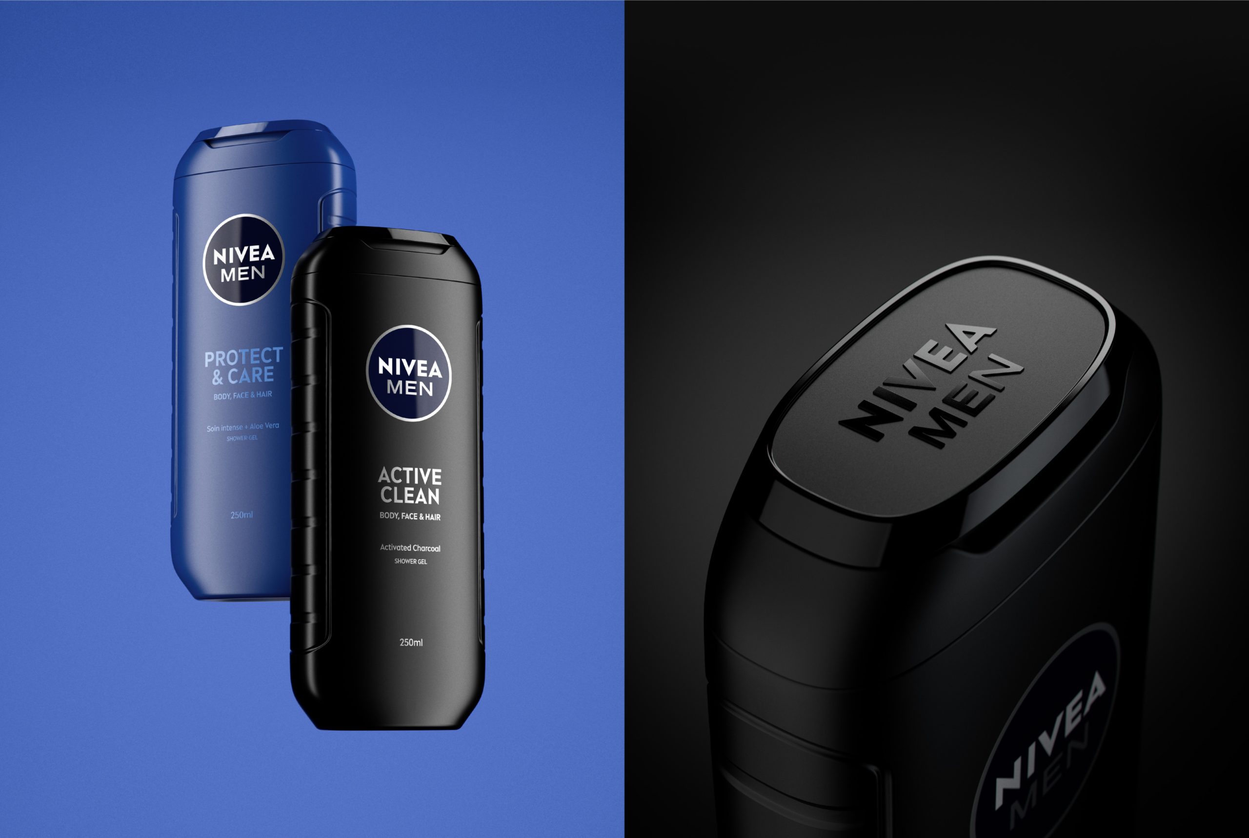 An early outcome of this collaboration was the new bottle for the Nivea Men shower gel range. The brief called for a design that would convey masculinity and efficiency while preserving the essence of the previous bottle. We opted for solid, straight, and bold shapes inspired by classic codes of masculinity, combined with a more modern, sporty feel. (The 250 ml format is widely used in gyms thanks to its easy-to-carry format.)