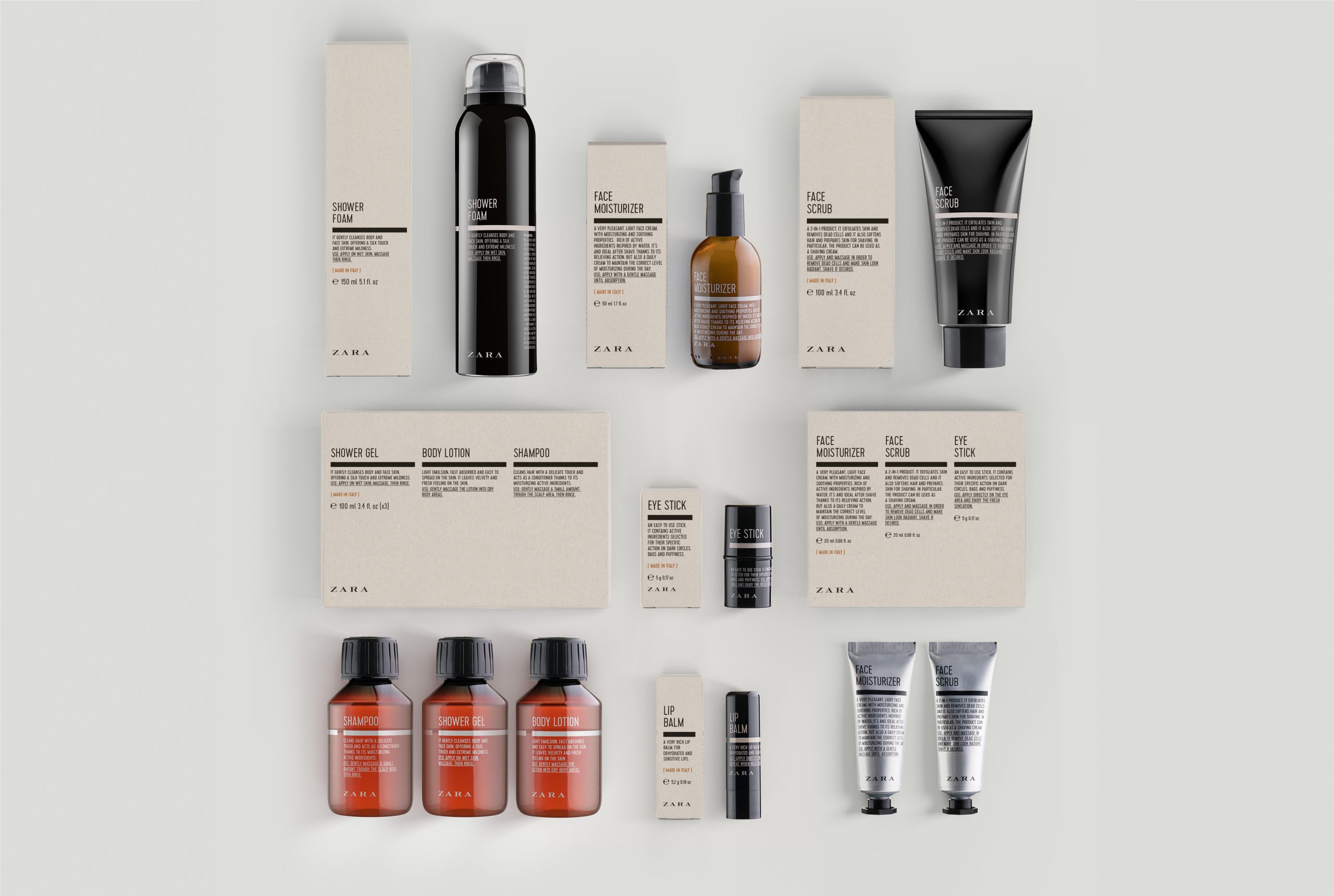 The aim was to develop a line of men’s cosmetics with an aesthetic closely resembling the designs found in old pharmacies, with bottles in an amber tone and the use of texts featuring the ingredients as the main element, and prominence given to the phrase “Made in Italy” on the front. The proposed designs are based on typographic solutions that remind you of the old labels on medicinal compounds found in pharmacies. The selection of the typographic fonts together with the composition of the texts strive to give the line its own personality and a language appropriate to the world of cosmetics. The colours employed underline the masculine character.